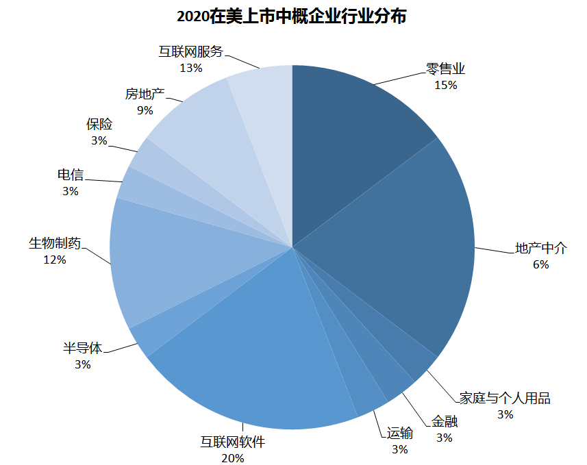 2020年中概股主要集中在教育、互联网、零售、制药、生物、房地产和汽车领域。具体的行业分布图如下所示。